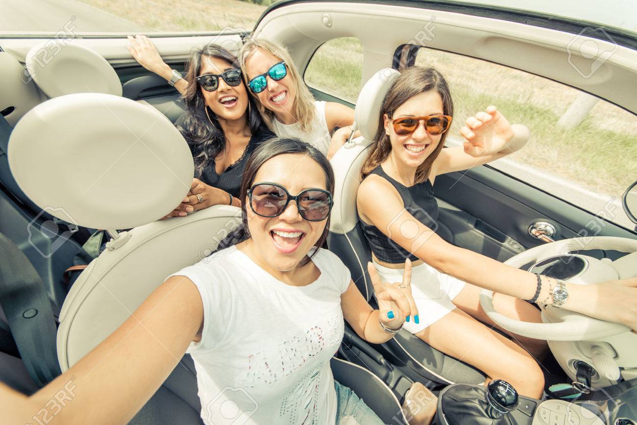 Group Of Girls Having Fun With The Car. Taking Selfie Hile Driving Stock Photo,